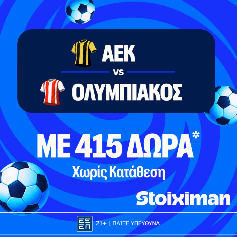 To μεγάλο ντέρμπι της Stoiximan Super League κλέβει την παράσταση με 415 Δώρα χωρίς* κατάθεση, έπαθλο ανταμοιβής και Bet Builder Boost 50%!